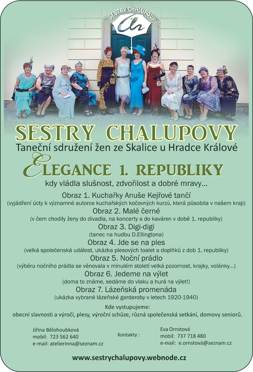 dovolujeme si Vás informovat o našem programu určeném především pro seniory, které nastudovala naše skupina z obce Skalice u Hradce Králové s názvem „Sestry Chalupovy“. Vystupujeme jak na schůzích, společenských setkáních, plesech tak při oslavách. Až na pár výjimek jsme všechny též v seniorském věku. Naše vystoupení, jak je popsáno na letáku, trvá i s přestávkami na přestrojení cca 1 hodinu. Při nastudování programu „Elegance 1. republiky“ jsme se snažili o maximální autentičnost jak hudby, tak kostýmů. Prostudovaly jsme mnoho odborné literatury i dobových časopisů, abychom obstály i před náročnými diváky. Za naše vystoupení požadujeme uhradit dopravné / jezdíme mikrobusem/ plus